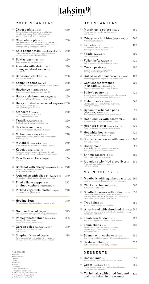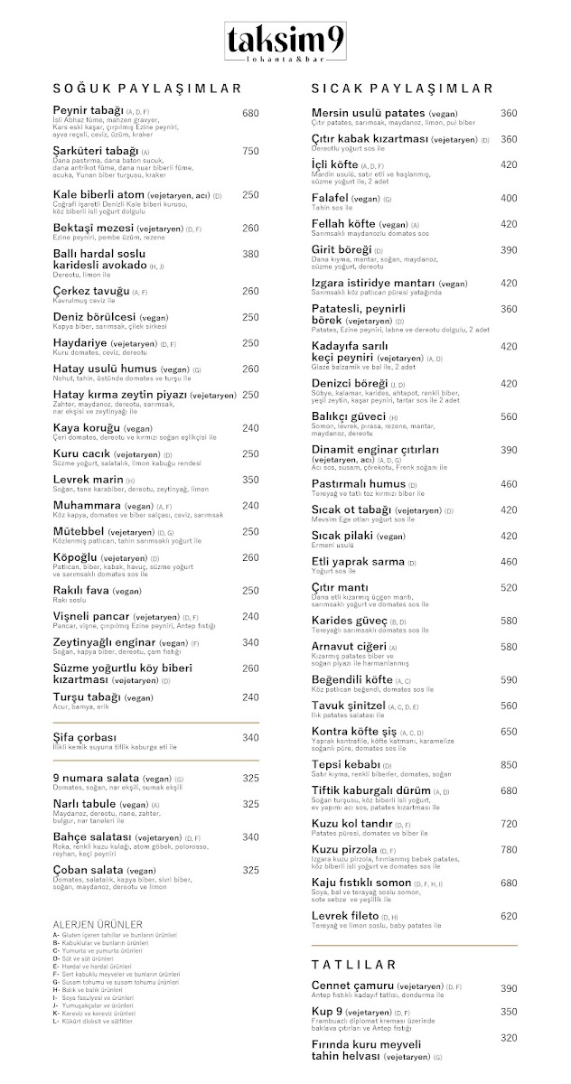 The menu at Taksim9 Lokanta&bar reflects a clear focus on approachable Turkish flavors, built around well-chosen appetizers that highlight freshness, texture, and balance. Dishes like Fried Zucchini with Cheeses and Çıtır Kabak show how the kitchen elevates a simple vegetable by pairing crisp, golden frying with the richness of melted and creamy cheeses, making them ideal starters to share. Tabule adds a lighter, refreshing contrast to the menu, bringing together herbs, grains, and a bright citrus note that helps balance the more indulgent fried selections. Meanwhile, Mersin Usulü Patates stands out as a bold, regional-style potato dish, seasoned and prepared in a way that emphasizes spice and comfort, appealing to guests who enjoy strong, savory flavors. Taken together, these highlighted items suggest a menu designed to satisfy both casual diners and those looking to explore familiar Turkish dishes with a slightly modern, bar-friendly presentation, where variety and consistency are clearly prioritized.
